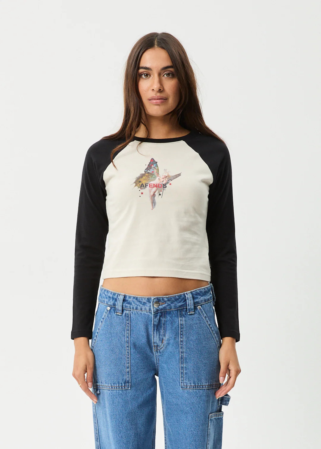 The 'Pixie' raglan long sleeve tee features a slim fit with contrast bind and sleeves for a casual look. The centre chest printed artwork adds a unique touch, making it a standout piece for everyday wear.