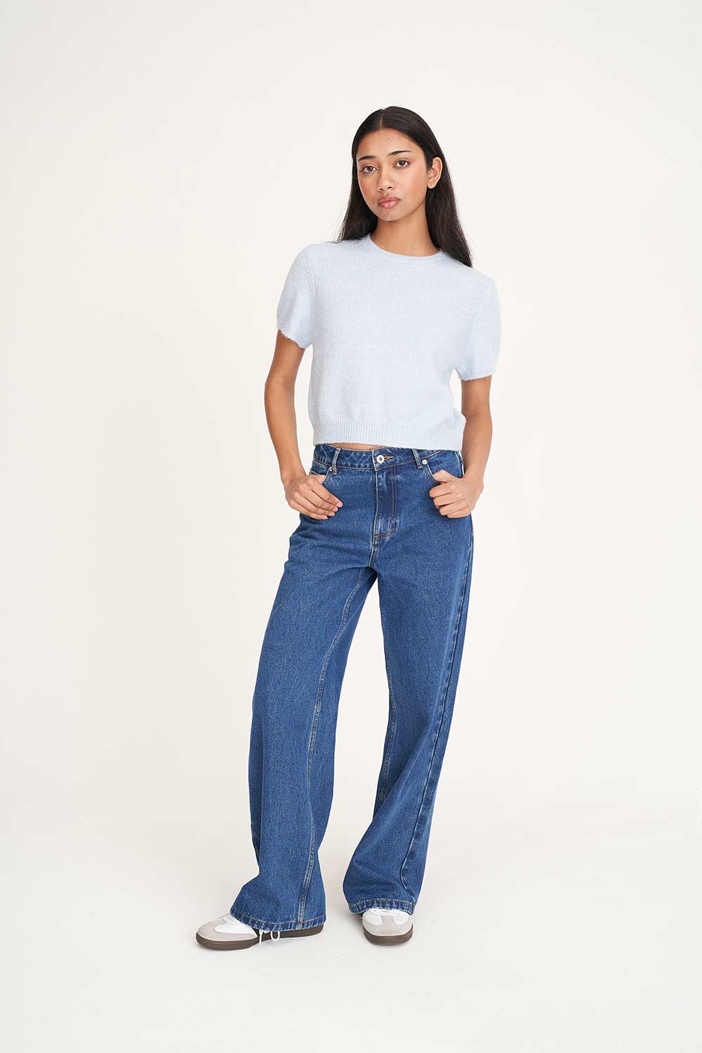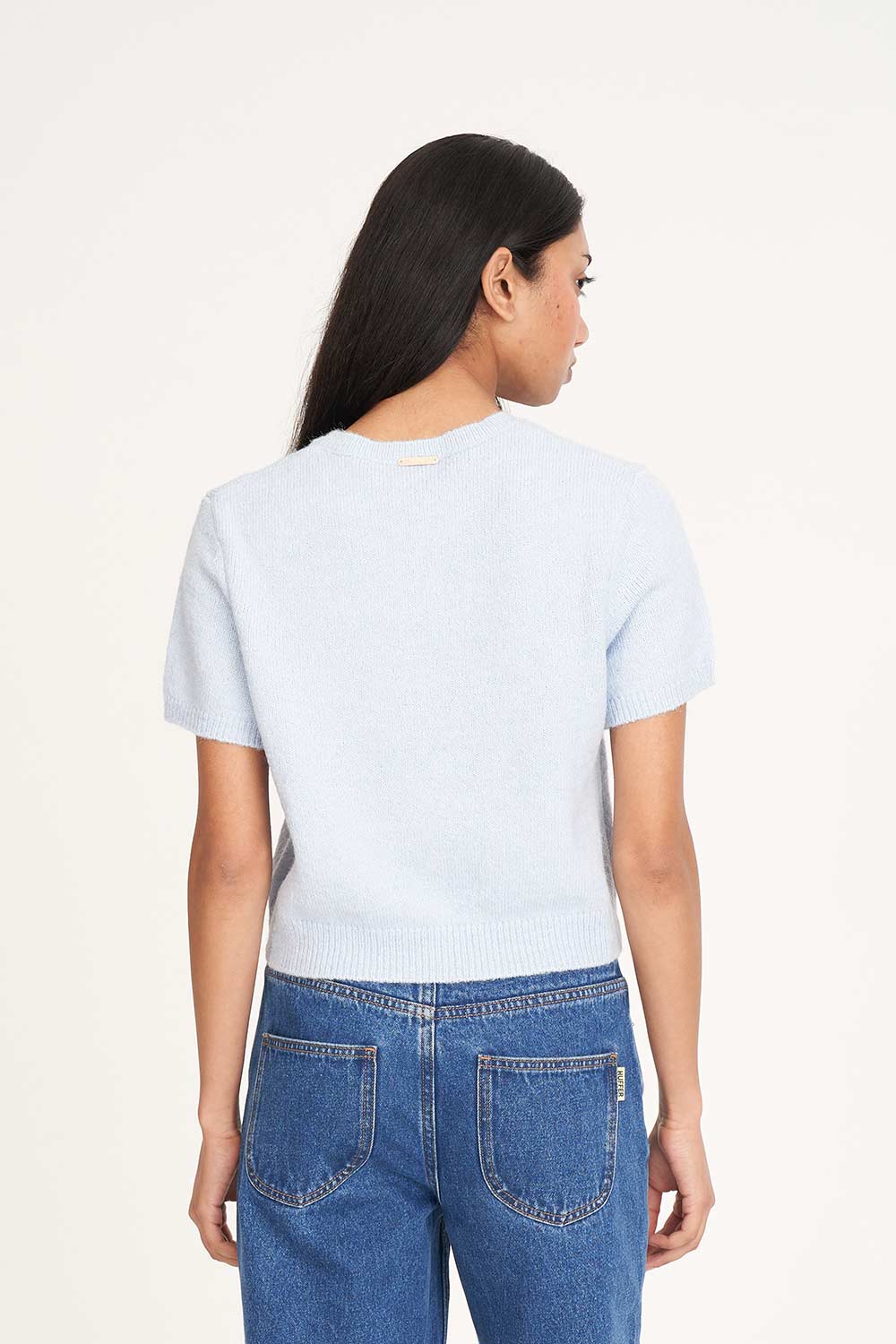 68% Acrylic 21% Nylon 8% Wool 3% Spandex / Fully fashion knit / Relaxed fit / Crew neck / Crop length / Short sleeve / Huffer branded embossed gold metal plate at back neck
