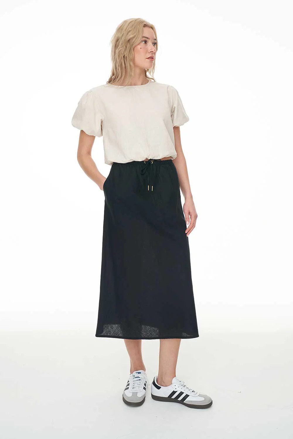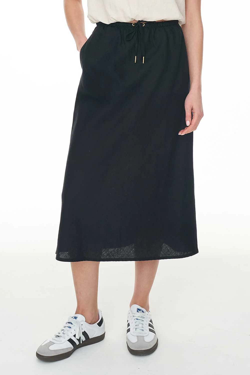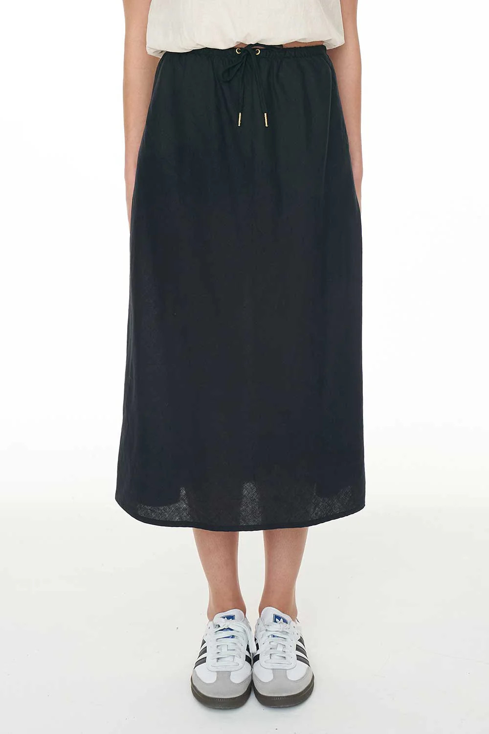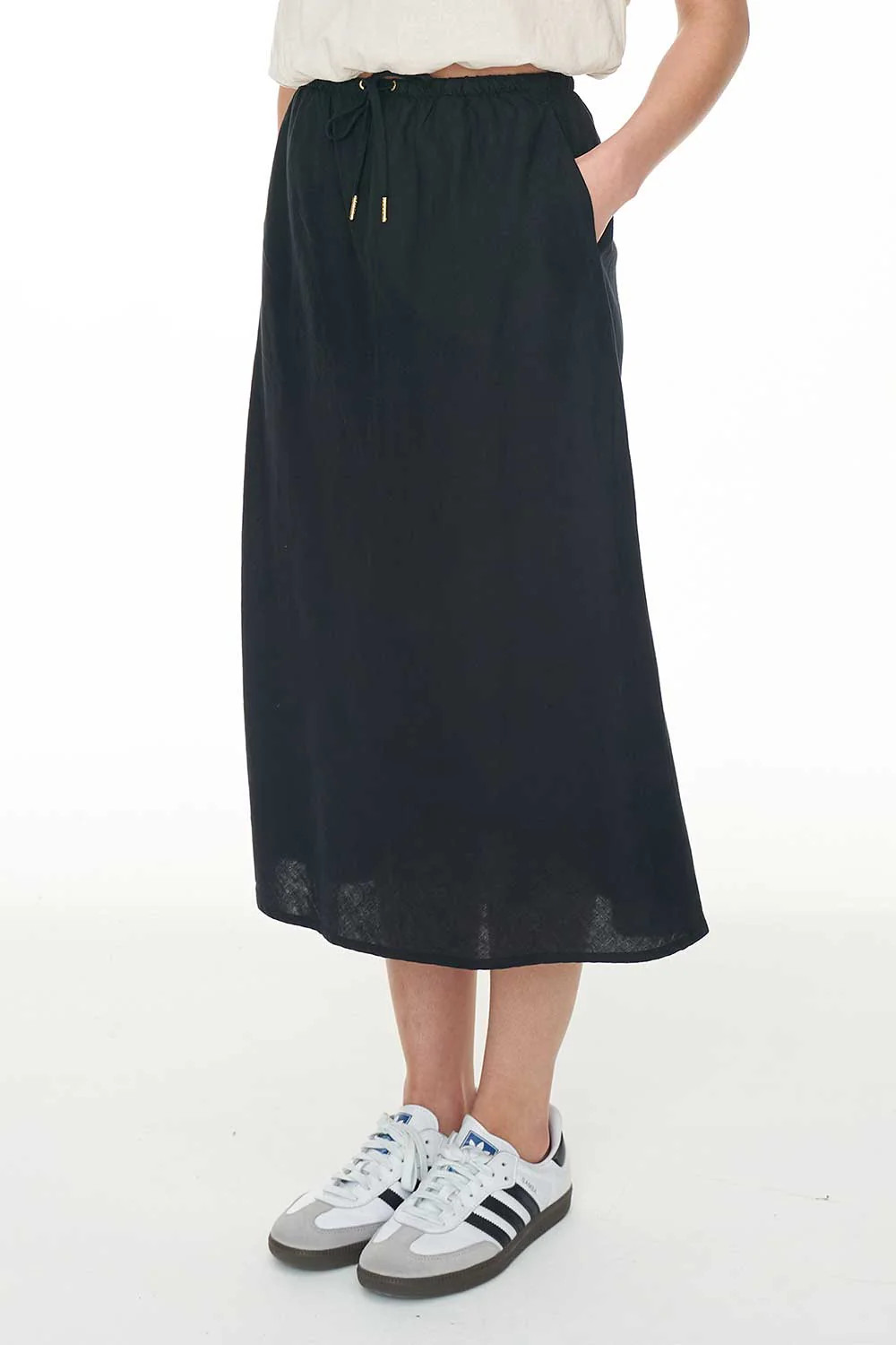 55% Linen 45% Cotton / 150gsm / Bias cut / Drawstring waistband / Midi length