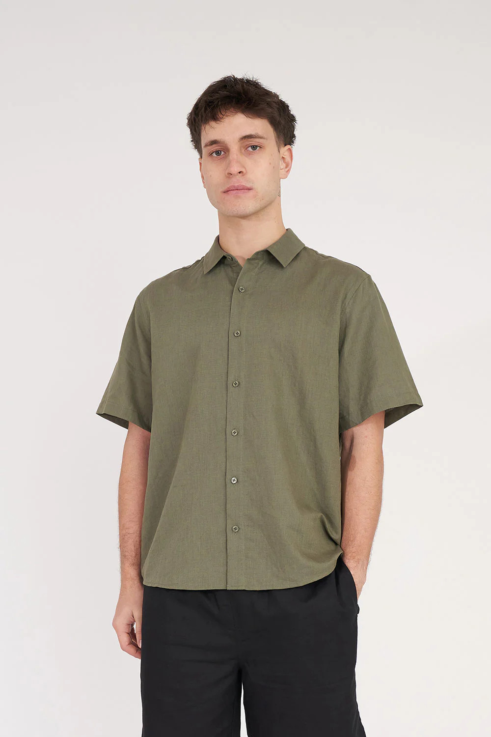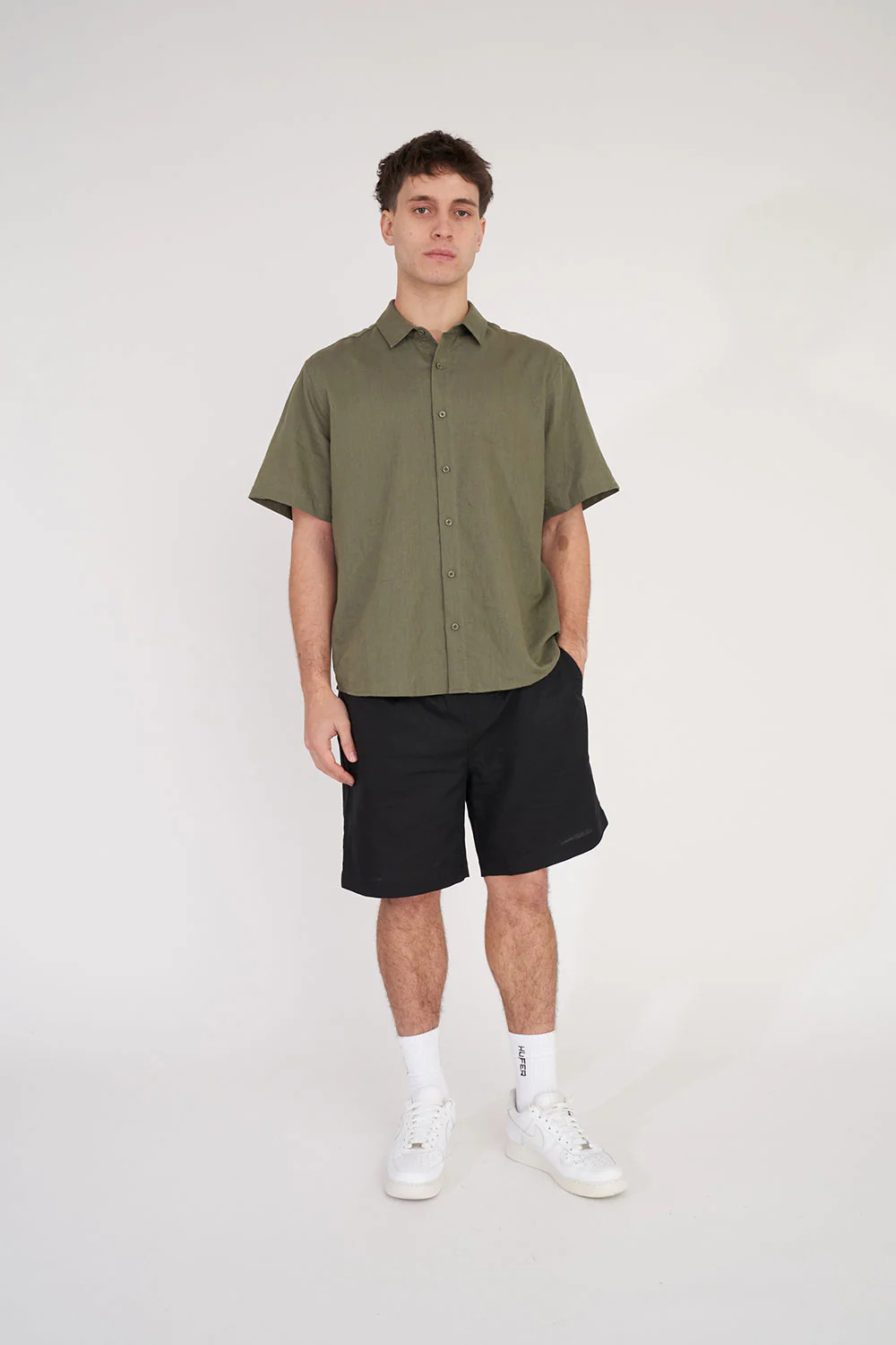 • What you need to know: 150gsm 55% Linen 45% Cotton, short sleeve, relaxed fit, camp collar, Huffer branded buttons and Huffer branded woven label