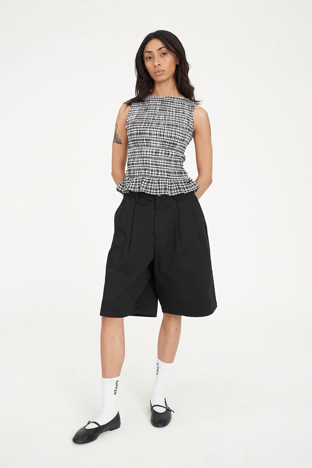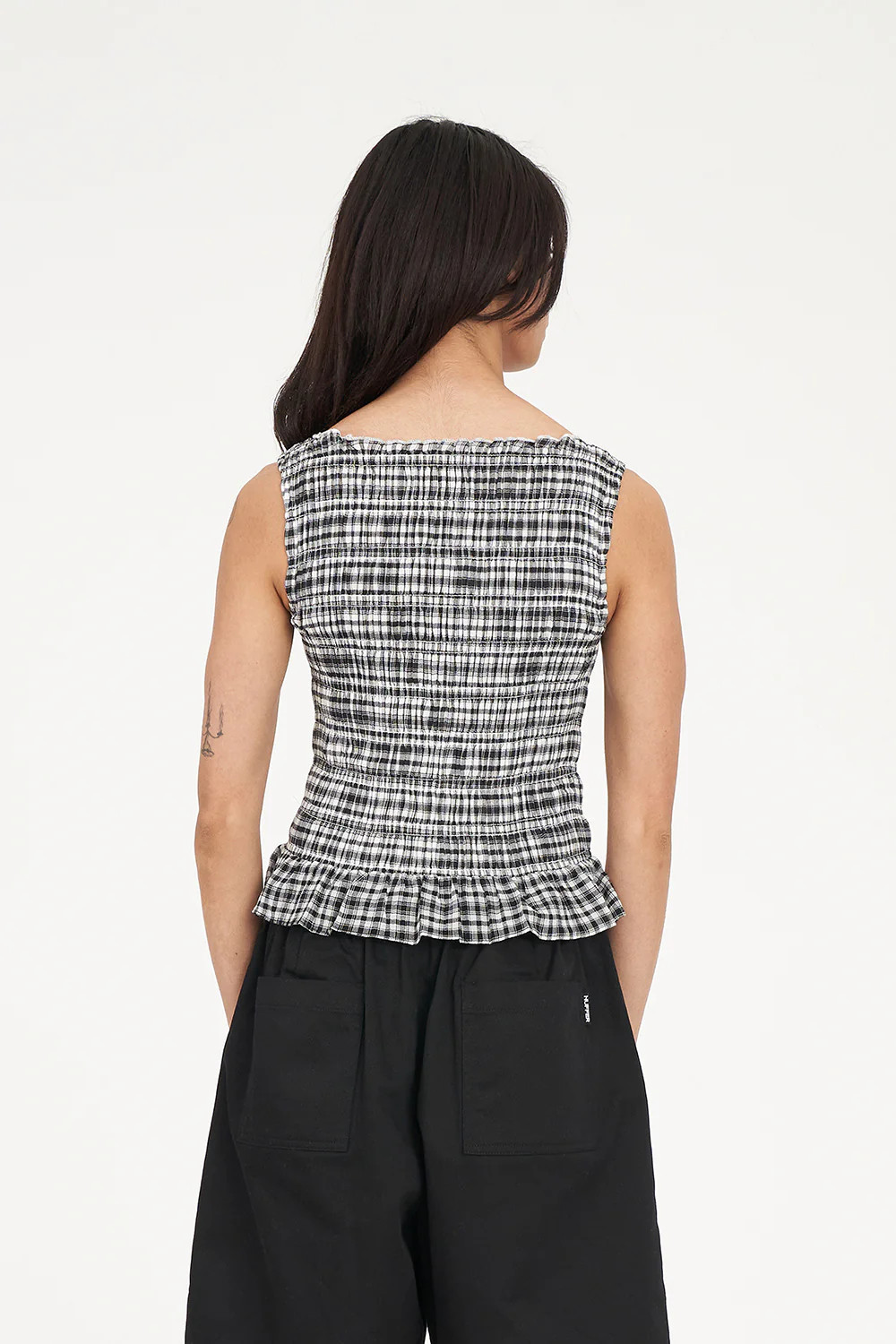 • What you need to know: 100% Cotton, 60gsm, Lightweight check, Crew neckline, Sleeveless, Shirred bodice, Hem ruffle, Huffer branded placement embroidery