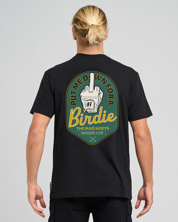 The Birdie SS Tee in Black is the ultimate way to rep Hueys on the green. Featuring a front chest and back graphic print, this golf tee shows off your love for the sport in style. The ribbed neck band and woven label in the side seam offer a refined touch, while the men's regular fit ensures comfort and a true-to-size fit. Perfect for the course or casual days, this tee is a hole-in-one for your wardrobe.